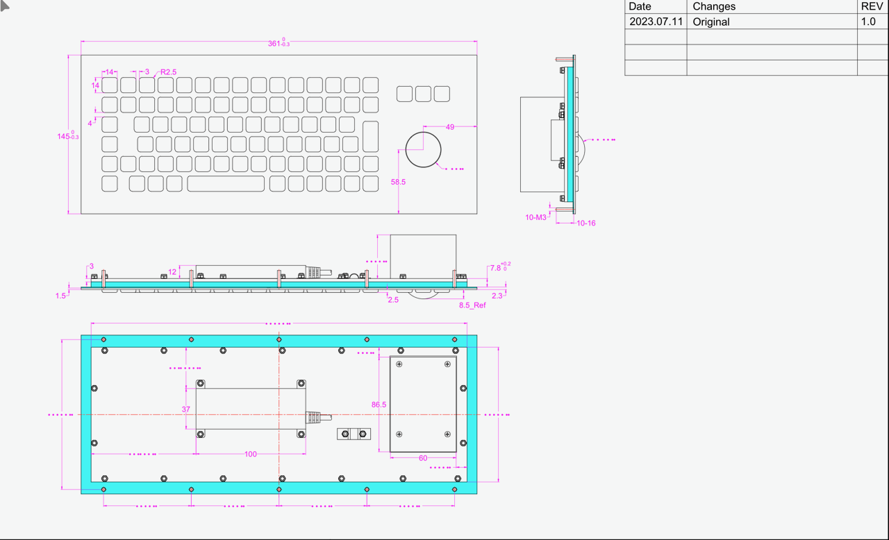 86 kláves (včetně 3 tlačítek myši) kompaktní formát IP65 odolná proti vandalismu průmyslová klávesnice s IP65 38,0mm mechanický modul trackballu z nerezové oceli s rozlišením 400 DPI pro rychlé a přesné umístění kurzoru, průmyslová deska plošných spojů s technologií spínačů carbon-on-gold s dlouhým zdvihem (1,50 ± 0,10 mm) s mimořádně dobrým hmatem pro rychlé a přesné zadávání dat bez jakéhokoli hluku, funkční klávesy F1, F2, F3...F10, F11, F12 jsou na horním řádku pro snadné ovládání. 3 tlačítka myši určená pro klikání vpravo a vlevo a rolování nahoru a dolů s kutálením kuliček, jedno kompletní těsnění ze silikonové pryže pod horní deskou z nerezové oceli pro snadnou montáž a těsné spojení se skříní, horní deska z nerezové oceli s bočními závitovými šrouby pro řešení montáže na horní panel. Který je vhodný pro venkovní použití s přímým deštěm a velmi drsným prostředím s vlhkostí, hodně dynamickou vodou, olejem,